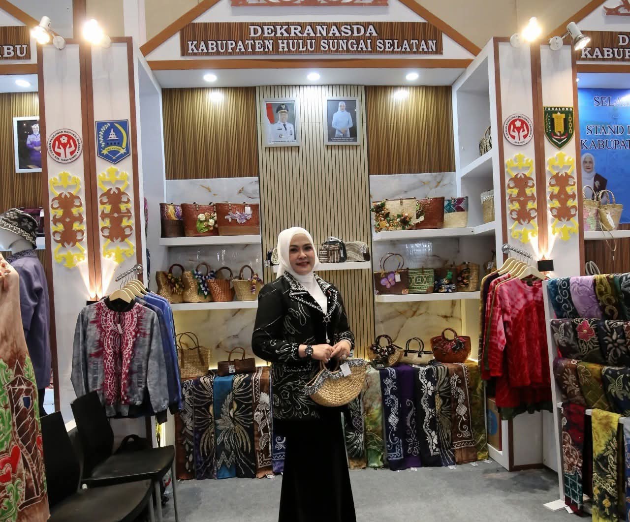 Ketua Dekranasda HSS, Hj. Mustaidah Syafrudin Noor, hadir secara langsung mendampingi para pelaku UMKM yang membawa karya unggulan Banua.