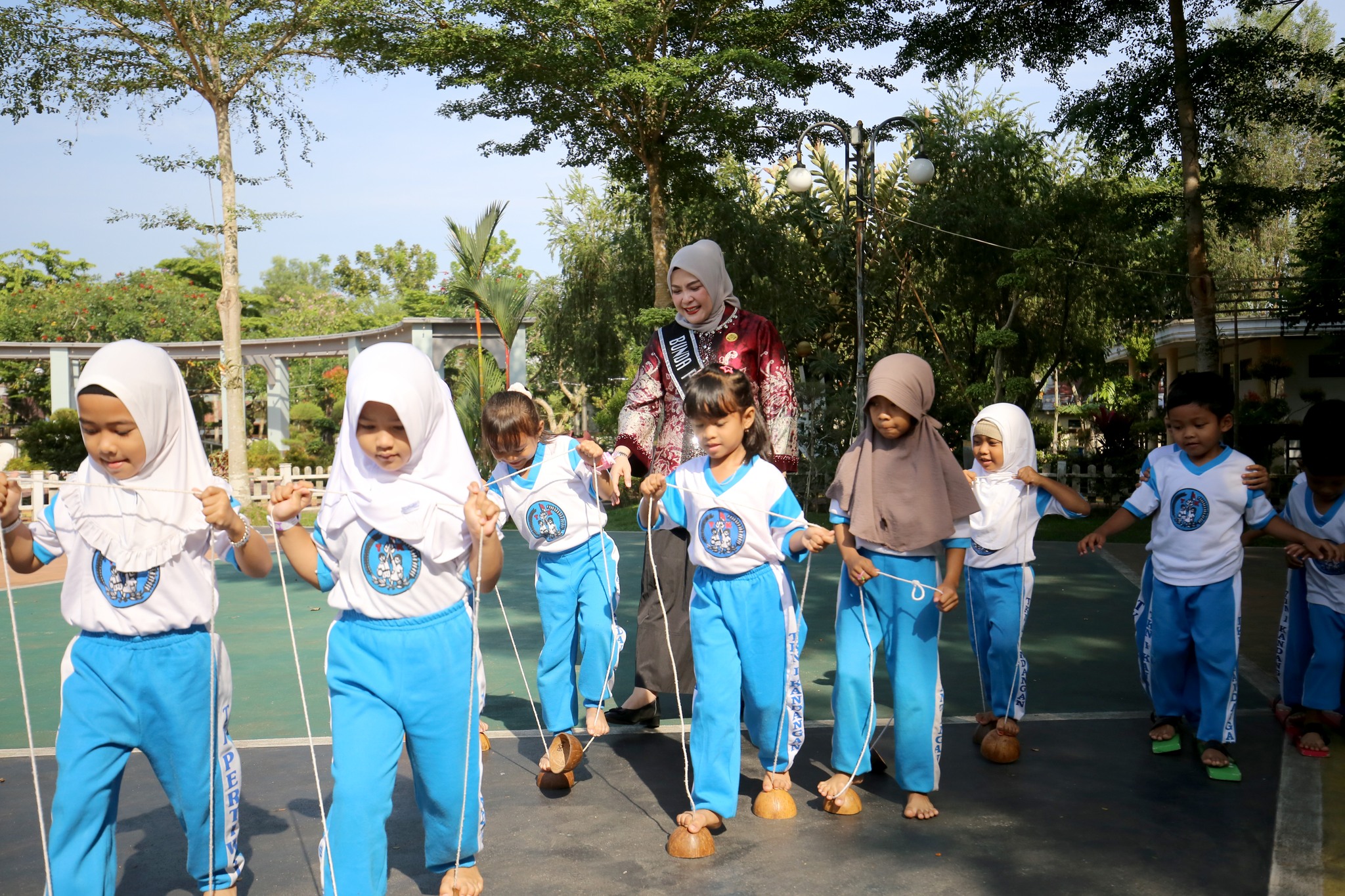 Suasana Taman Palidangan Sehati, Kandangan, mendadak penuh tawa ceria, Rabu (08/10). Di tengah semilir angin pagi, Bunda PAUD Kabupaten Hulu Sungai Selatan (HSS), Hj. Tata Syafrudin Noor, ikut turun ke lapangan secara langsung untuk bermain bersama anak-anak TK Negeri 1 Kandangan. Bukan hanya sekedar bermain, Bunda PAUD HSS turut mendukung pendidikan anak usia dini dengan cara yang menyenangkan dan bermuatan lokal melalui kegiatan bertema “Peningkatan Cinta Banua melalui Permainan Tradisional”.