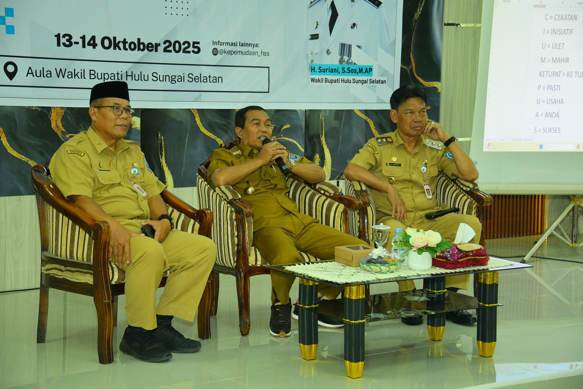 Bupati Hulu Sungai Selatan (HSS), H. Syafrudin Noor, SE., S.Sos, memberikan semangat dan motivasi kepada para peserta Pelatihan dan Pendidikan Kepemudaan yang mengusung tema “Pemimpin Muda Pembawa Perubahan”, bertempat di Pendopo Wakil Bupati HSS, Senin (13/10/2025).