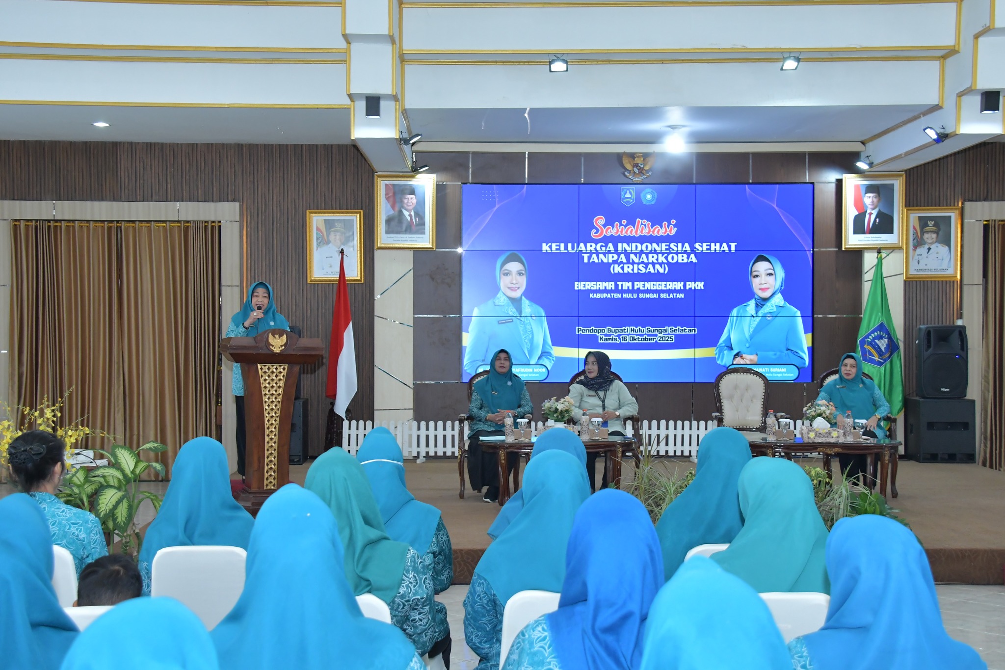 KANDANGAN – Tim Penggerak Pemberdayaan Kesejahteraan Keluarga (TP-PKK) Kabupaten Hulu Sungai Selatan (HSS) melalui Kelompok Kerja (Pokja) I, bersinergi dengan Badan Narkotika Nasional (BNN) Kabupaten HSS menggelar Sosialisasi Keluarga Indonesia Sehat Tanpa Narkoba (Krisan). Acara ini dilaksanakan pada Kamis, 17 Oktober 2025, bertempat di Aula Pendopo Bupati, Kandangan. Sosialisasi ini secara resmi dibuka oleh Wakil Ketua TP-PKK Kabupaten HSS, Hj. Misnawati Suriani, yang hadir mewakili Ketua TP-PKK, Hj. Tata Syafrudin Noor. Kegiatan ini diikuti oleh anggota kader PKK Kabupaten serta perwakilan kader Pokja I dari seluruh kecamatan se-HSS.