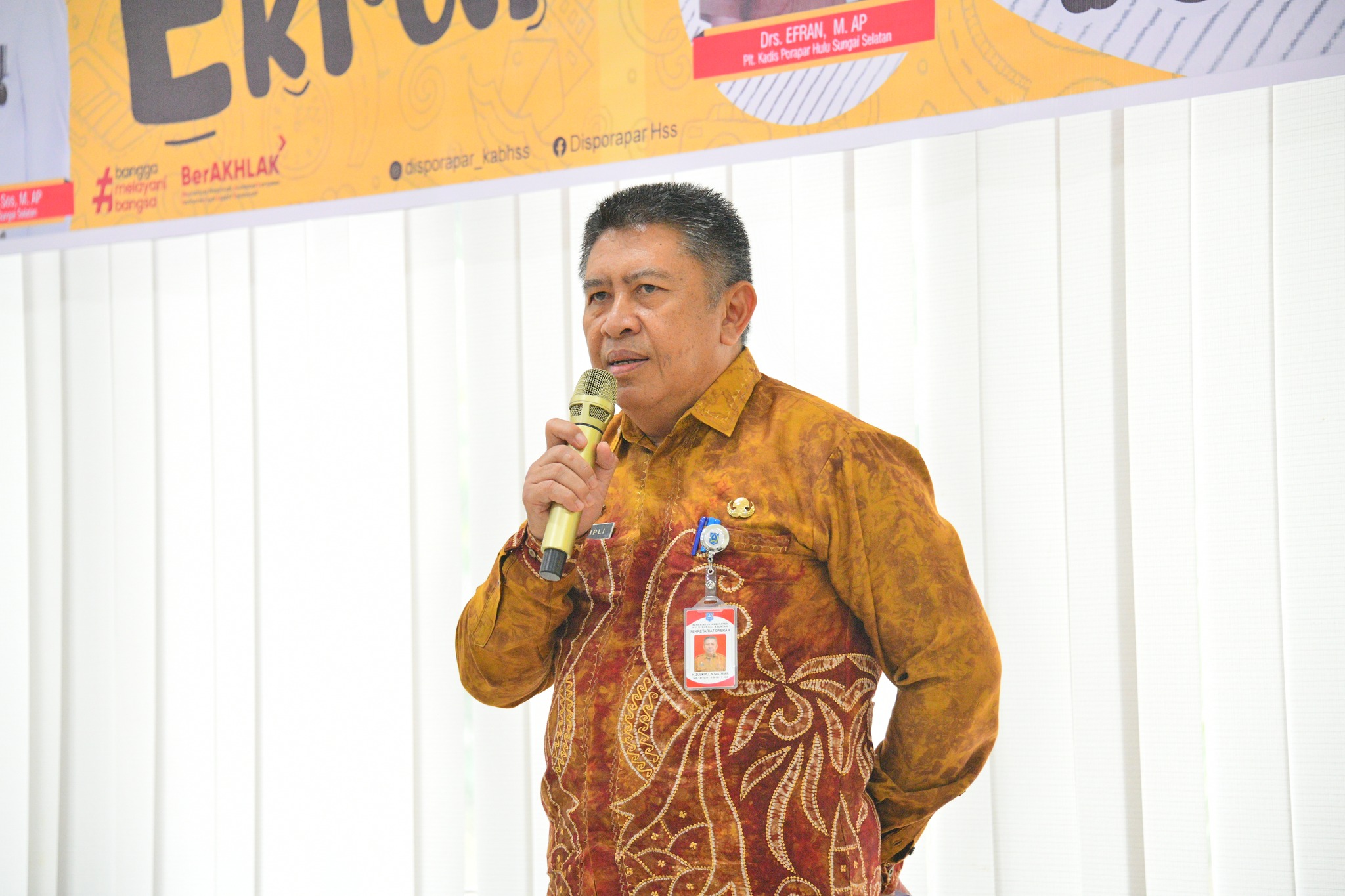 Bertempat di Aula Dinas Pemuda, Olahraga, dan Pariwisata (Disporapar) Kabupaten Hulu Sungai Selatan (HSS), Asisten Perekonomian dan Pembangunan Setda Kab. HSS, H. Zulkifli, S.Sos., M.AP., secara resmi membuka kegiatan Pelatihan Hospitality bagi Pelaku Ekonomi Kreatif (Ekraf), Kamis (23/10).