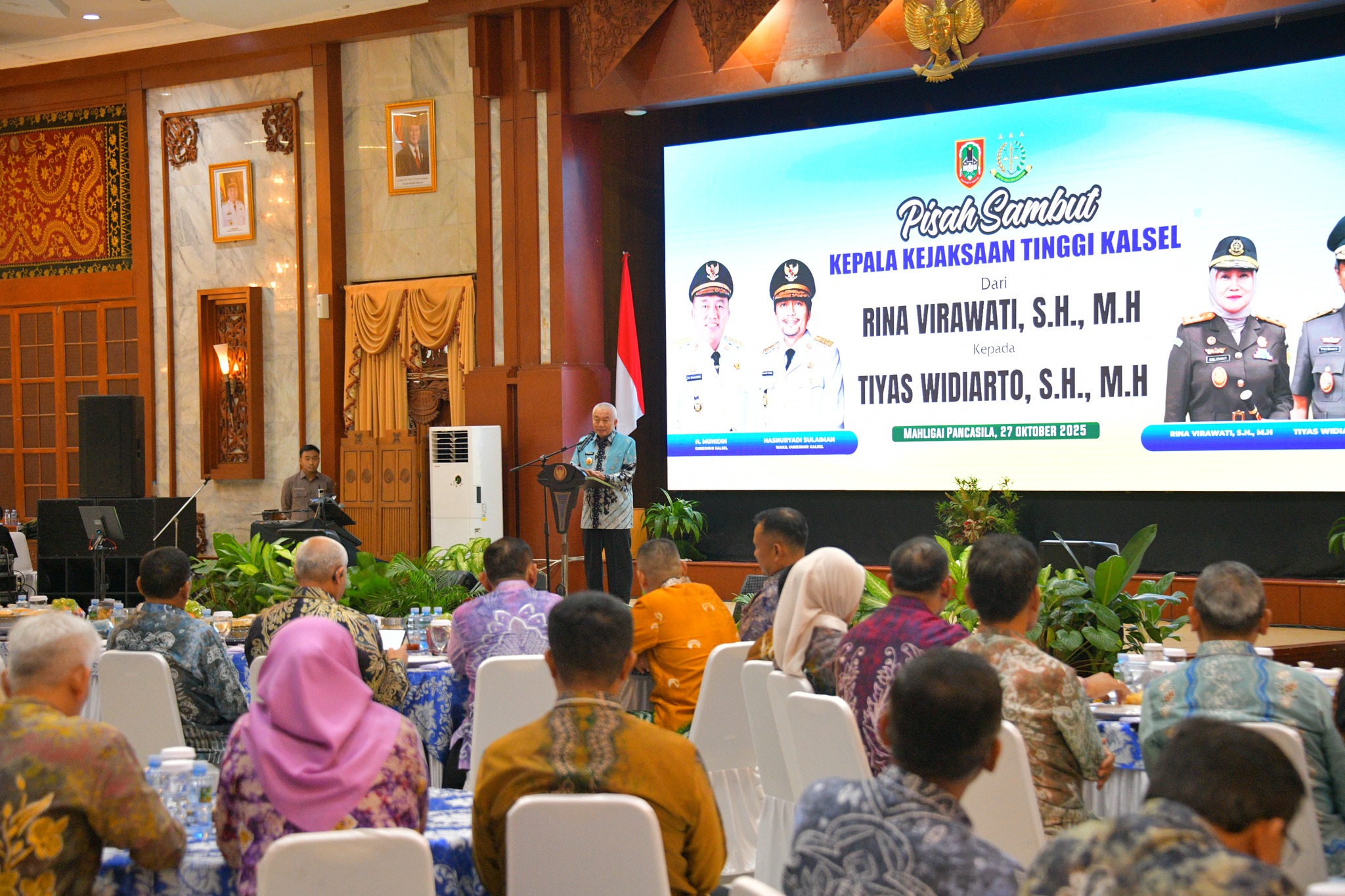Bertempat di Mahligai Pancasila, Wakil Bupati Hulu Sungai Selatan H. Suriani, S.Sos., M.AP menghadiri acara Pisah Sambut Kepala Kejaksaan Tinggi Kalimantan Selatan dari Rina Virawati, S.H., M.H kepada Tiyas Widiarto, S.H., M.H, pada Senin (27/10).
