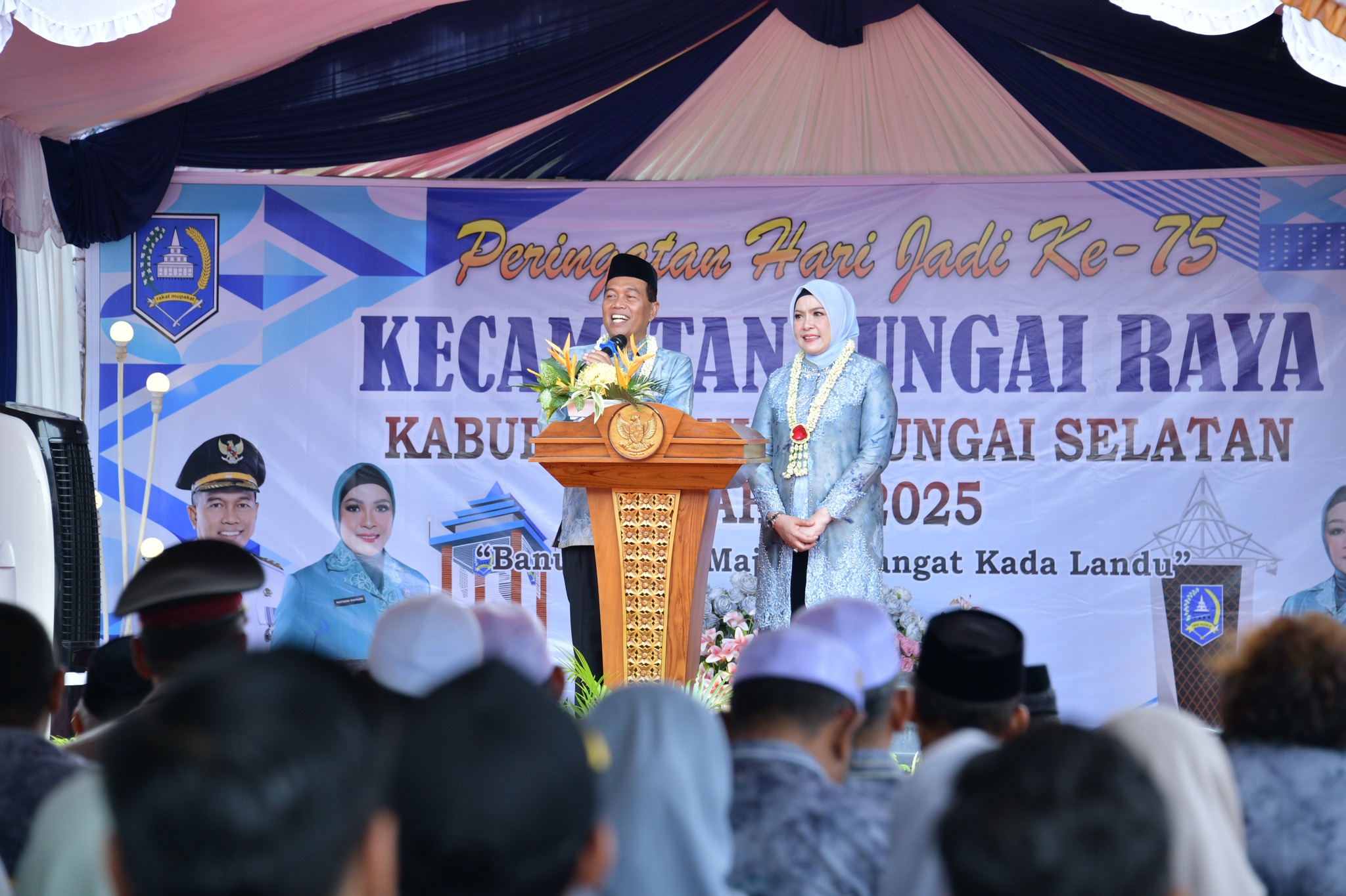 Dalam sambutannya, Bupati HSS H. Syafrudin Noor menyampaikan ucapan selamat Hari Jadi ke-75 kepada seluruh masyarakat Kecamatan Sungai Raya. Ia menegaskan bahwa usia 75 tahun merupakan perjalanan panjang yang sarat dengan sejarah, perjuangan, dan pengabdian para pendahulu dalam membangun Kecamatan Sungai Raya hingga berkembang seperti saat ini.