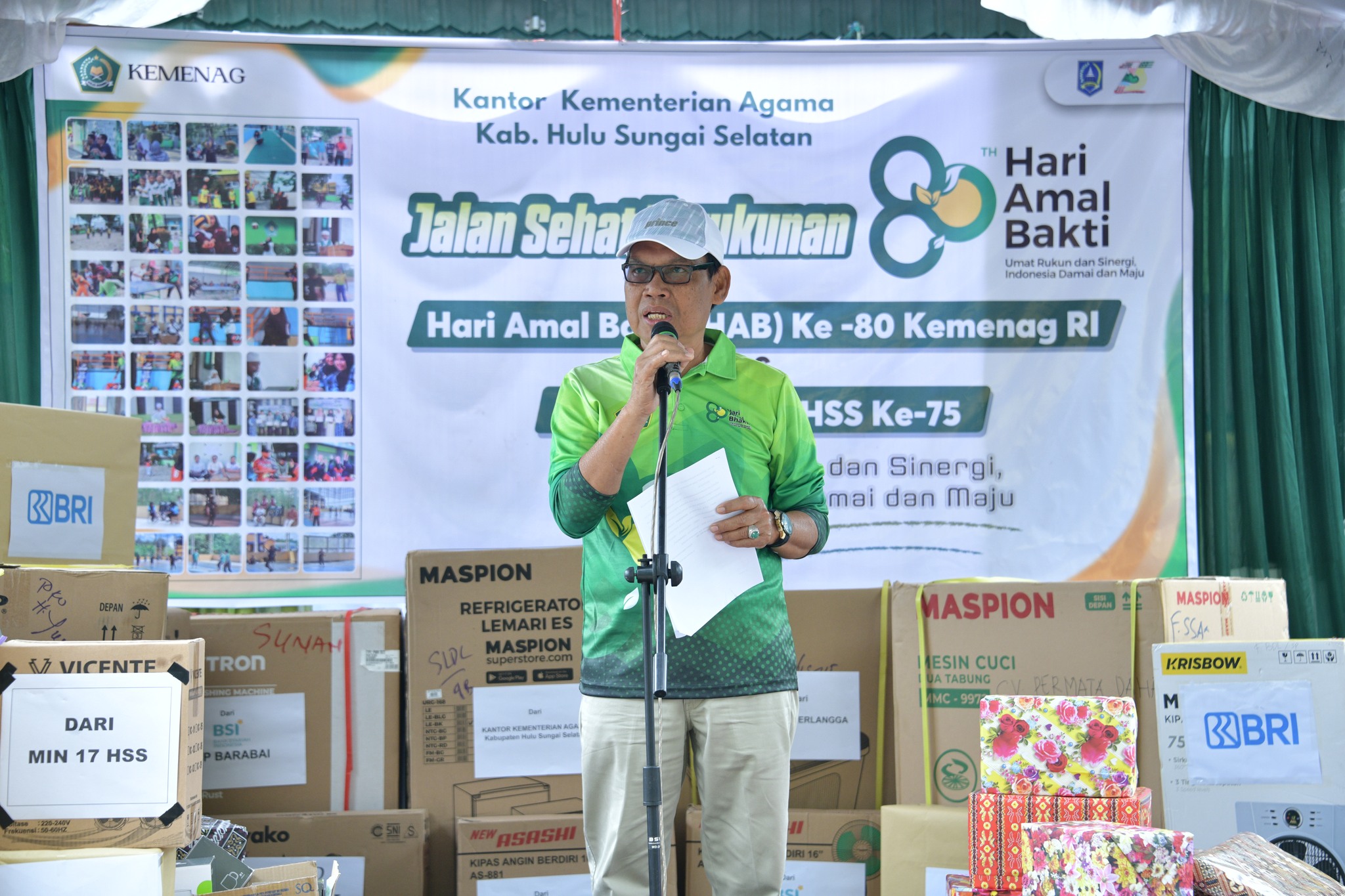 Pelaksana Tugas Kepala Kementerian Agama Kabupaten HSS H. Fathurrahman dalam laporannya menyampaikan bahwa kegiatan jalan sehat ini menjadi wujud kebersamaan dan kekompakan yang menyehatkan bagi seluruh peserta. Menurutnya, kegiatan ini juga menjadi bentuk komitmen bersama dalam menjaga kerukunan umat beragama, memperkuat sinergi, serta mendukung program Pemerintah Kabupaten Hulu Sungai Selatan menuju daerah yang damai dan maju.