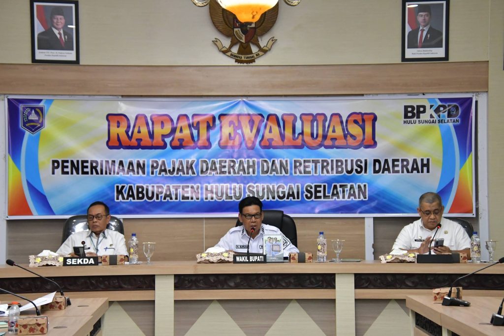 Wakil Bupati Hulu Sungai Selatan (HSS), H. Suriani, S.Sos., M.AP., bersama Sekretaris Daerah Kabupaten HSS, Drs. H. Muhammad Noor, M.AP., didampingi Kepala BPKPD HSS, Drs. H. Nanang FMN, M.Si, memimpin Rapat Evaluasi Penerimaan Pajak dan Retribusi Daerah yang digelar di Aula Ramu pada Selasa (08/04/2026).