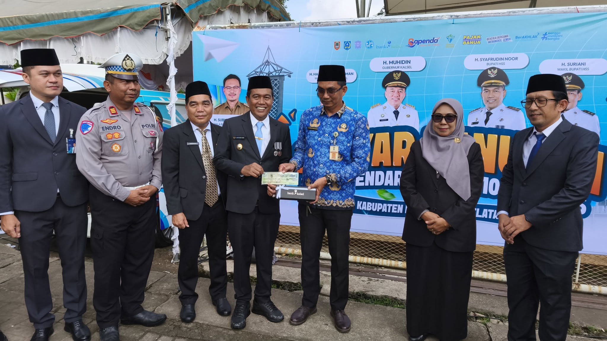 Setelah selesai upacara Bupati HSS bersama Forkopimda melakukan penyerahan simbolis notice pajak dan pelayanan layanan dalam rangka Gebyar Panutan Pajak Kendaraan Bermotor Tahun 2025, selanjutnya diserahkan pula mobil operasional untuk Dinas Ketahanan Pangan dan Dinas Perdagangan Kabupaten Hulu Sungai Selatan.