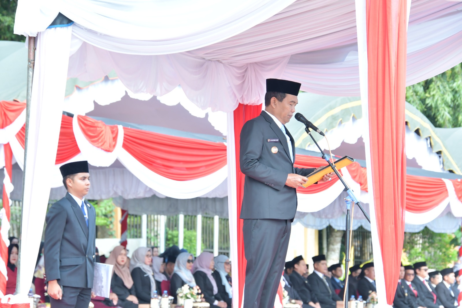 Bupati HSS H. Syafrudin Noor, SE, S.Sos bertindak sebagai inspektur upacara, didampingi Sekretaris Daerah Kabupaten HSS Drs. H. Muhammad Noor, M.AP, Forkopimda HSS, para asisten, staf ahli, kepala OPD, camat se-Kabupaten HSS, serta undangan lainnya. Sementara peserta upacara terdiri dari ASN lingkup HSS, PGRI, DHC 45 HSS, organisasi kemasyarakatan, Pramuka, mahasiswa, hingga para pelajar.